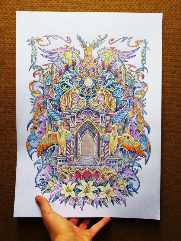 Description: Watercolor and colored pencil illustration on aquarelle paper, size A3. My artwork shows an entrance gate which leads to a safe and peaceful place away from this worlds threats. The gate is made up of elements which have symbolic meaning like the birds and wings symbolizes freedom, the flowers and butterflies stand for peace, the stag with olive branch antlers signifies peace and spirituality. The colorful interwined lines create a lion face with open mouth. He is the powerful guardian of those who entered the gate.