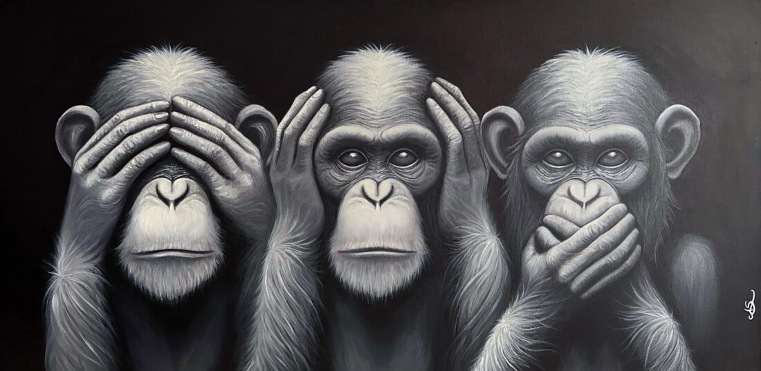Description: This painting reinterprets the classic “Three Wise Monkeys” motif in a monochromatic style, symbolising ignorance, denial, and silence in the face of truth. In the context of a vision for the future, it serves as a stark warning: if humanity continues to turn a blind eye, cover its ears, and silence its voice against pressing global issues, we risk a dystopian fate.